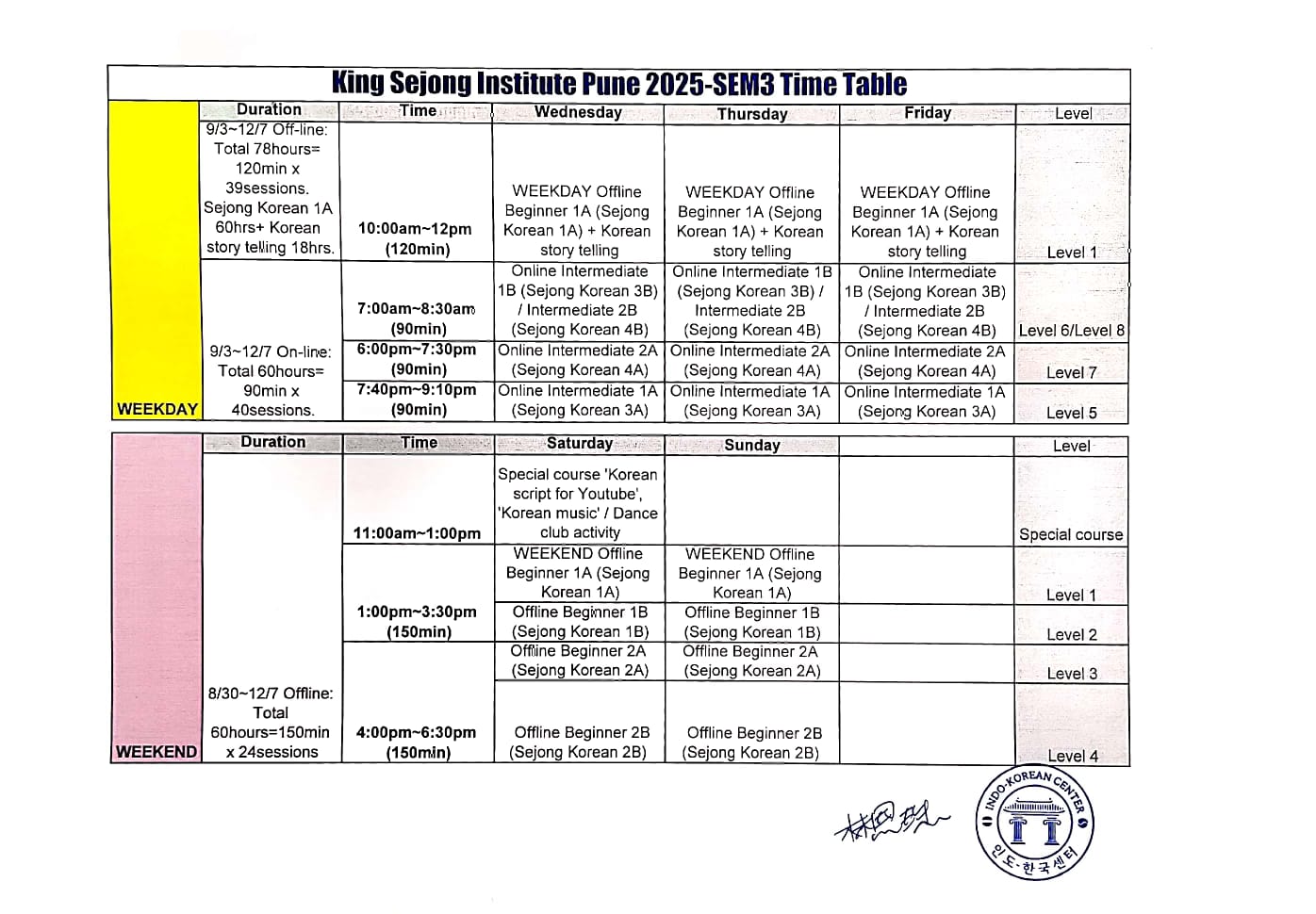 Proposed TIME TABLE for 2025-SEM-2- IKC King Sejong Institute Pune ‘Korean language & culture’ course.