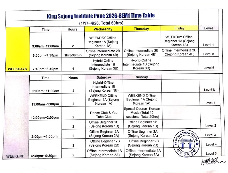 Proposed TIME TABLE for 2026-SEM-1- IKC King Sejong Institute Pune ‘Korean language & culture’ course.