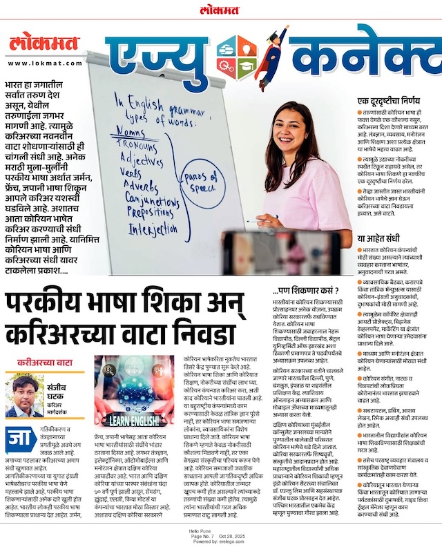 Lokmat Marathi news article on KOREAN LANGUAGE as a skill set for career opportunities by Mr Sanjib Ghatak, CDC Director and Co-founder Indo Korean Center Pune. (Click above image for Article in Lokmat)